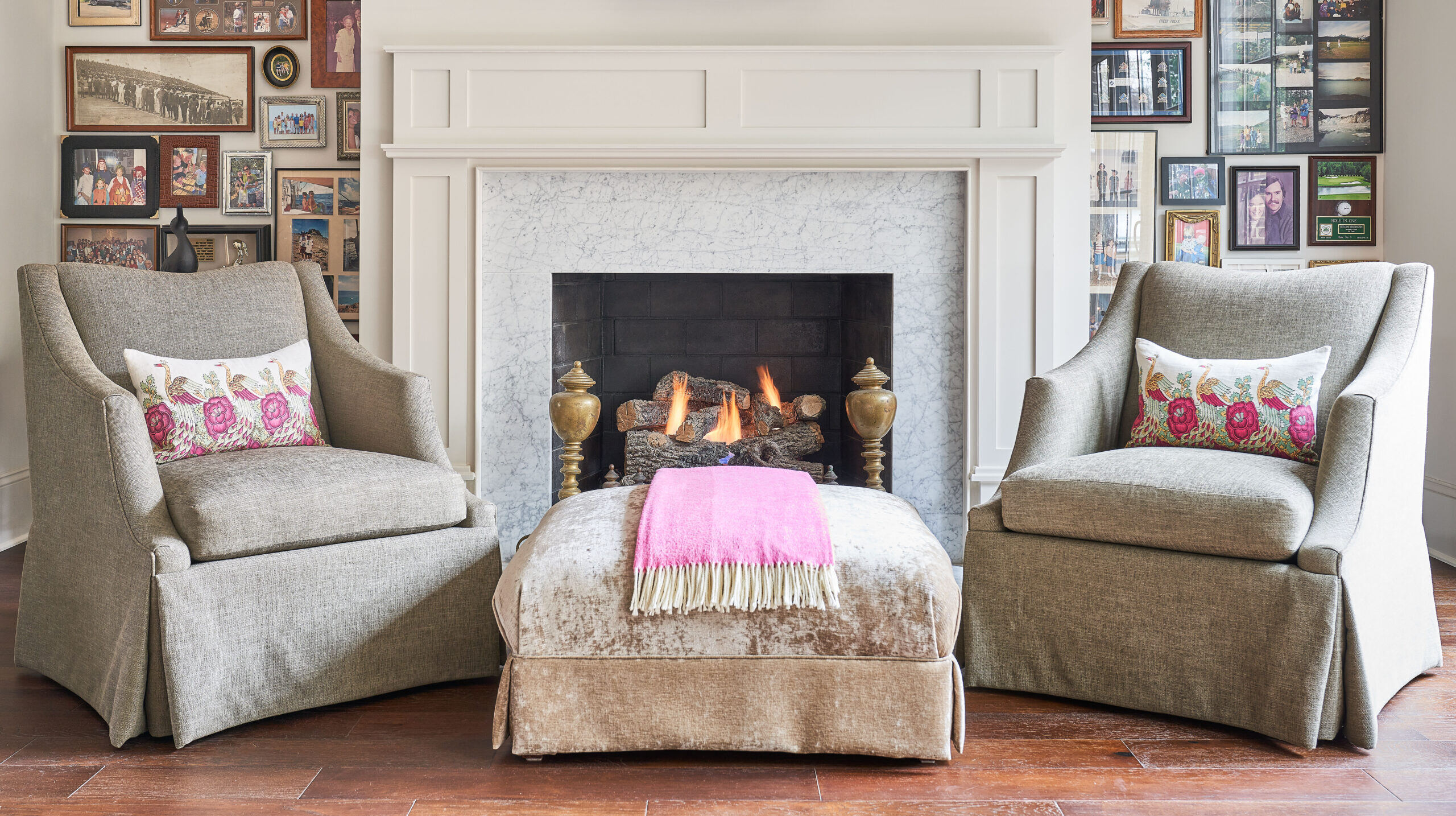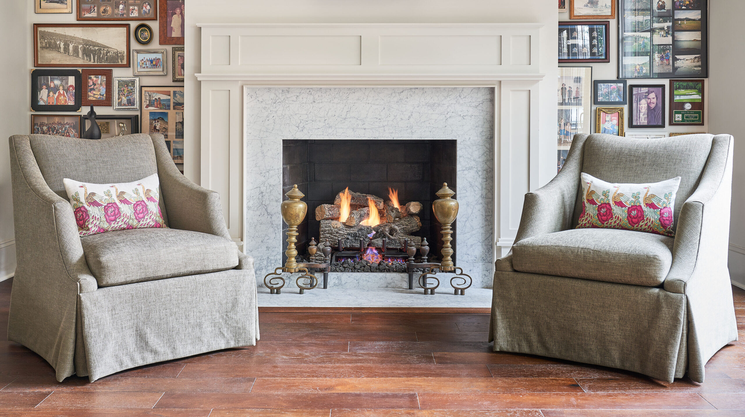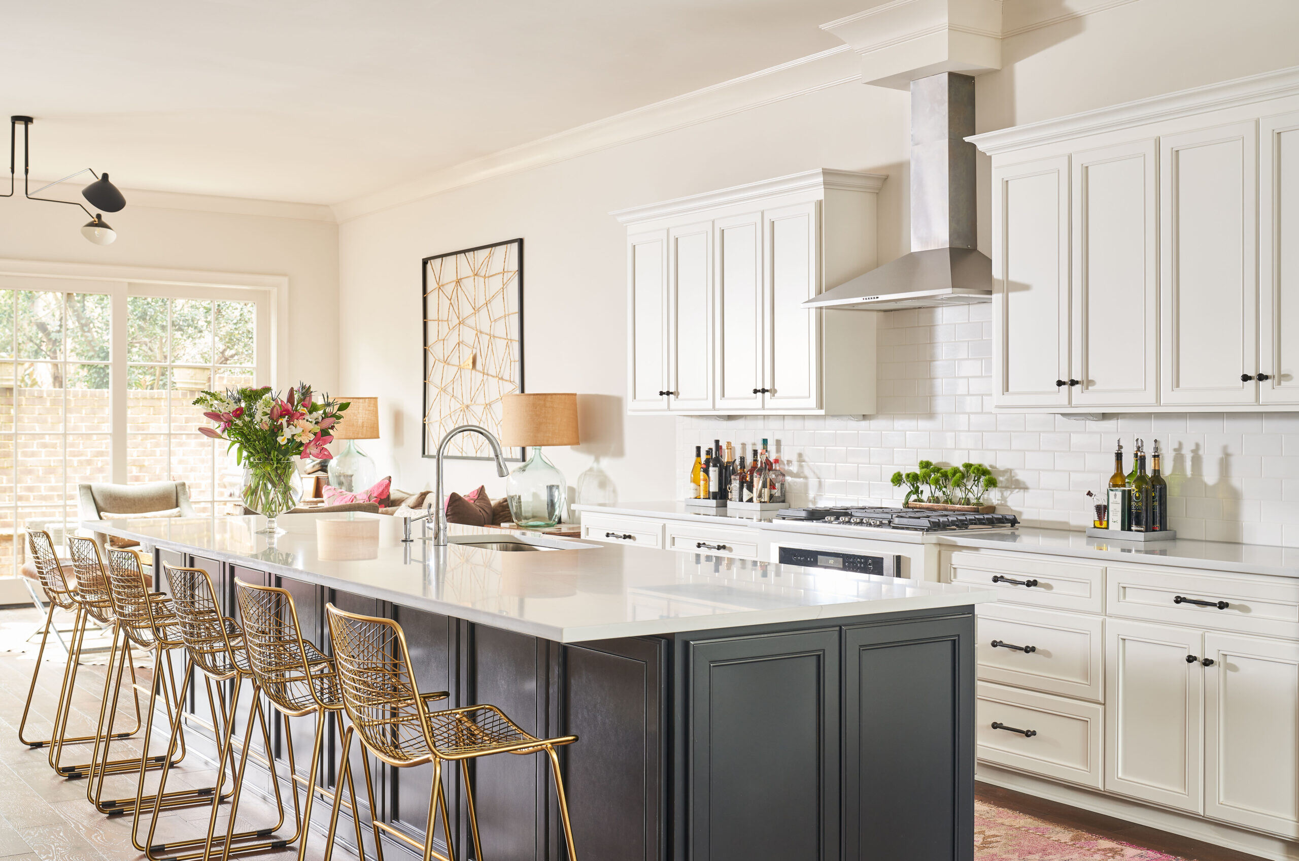 The designer selected Palmetto Road Monet Strasbourg for the hardwood floors throughout the first floor. A spacious island fills the kitchen with Quartz Aurea Lincoln countertops and Eudy's Norcraft White cabinetry. The large sliding doors to the backyard inspired the buyers to then build a custom fireplace to extend the living space from inside to outside.