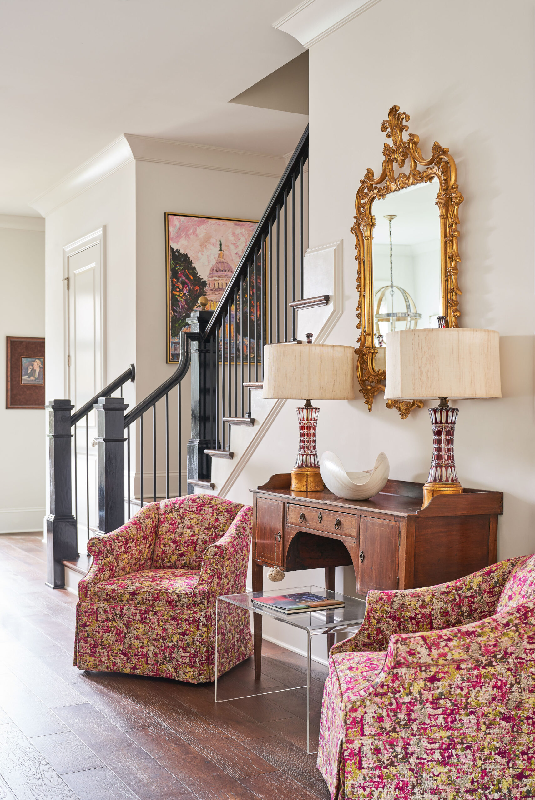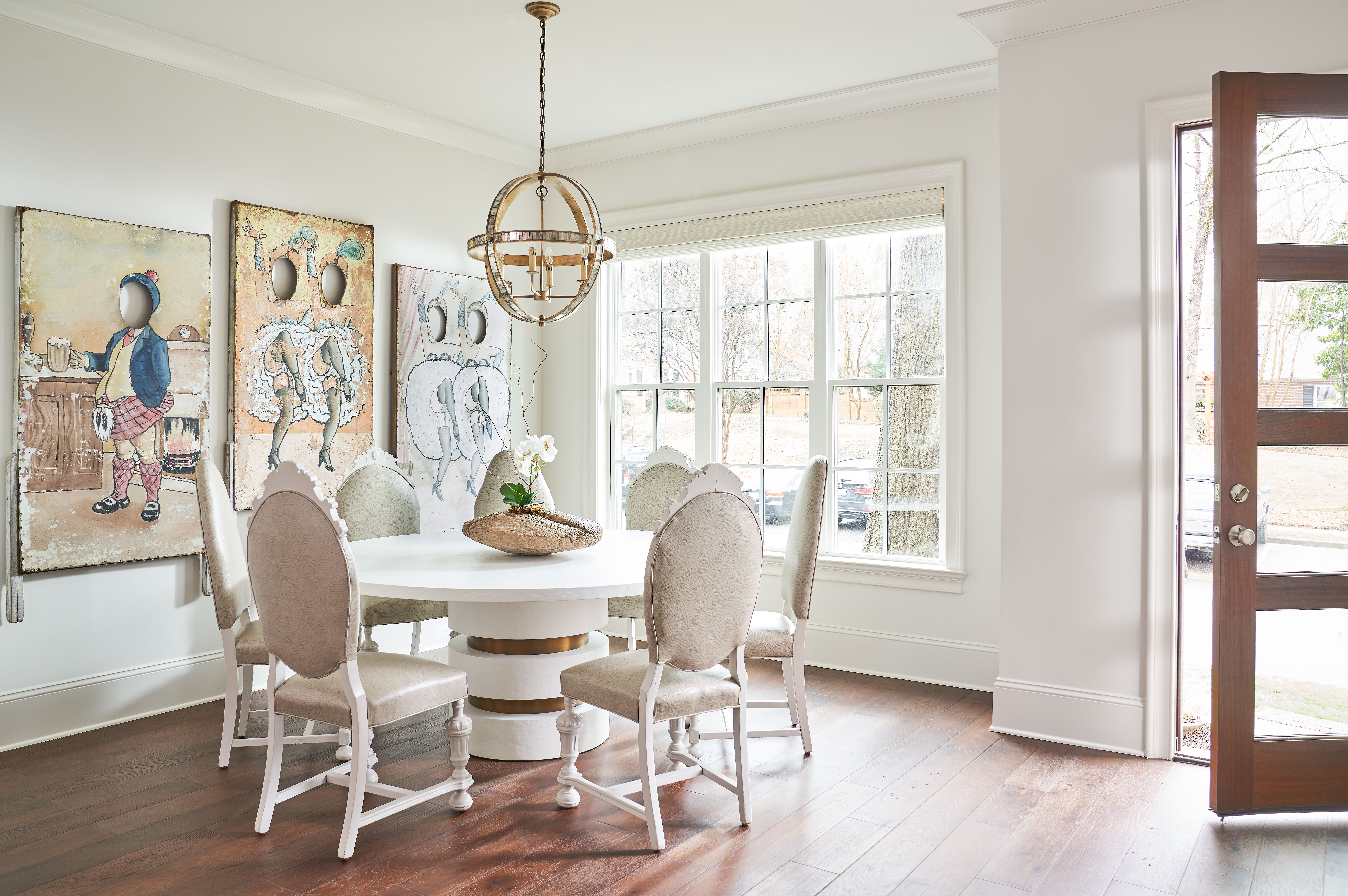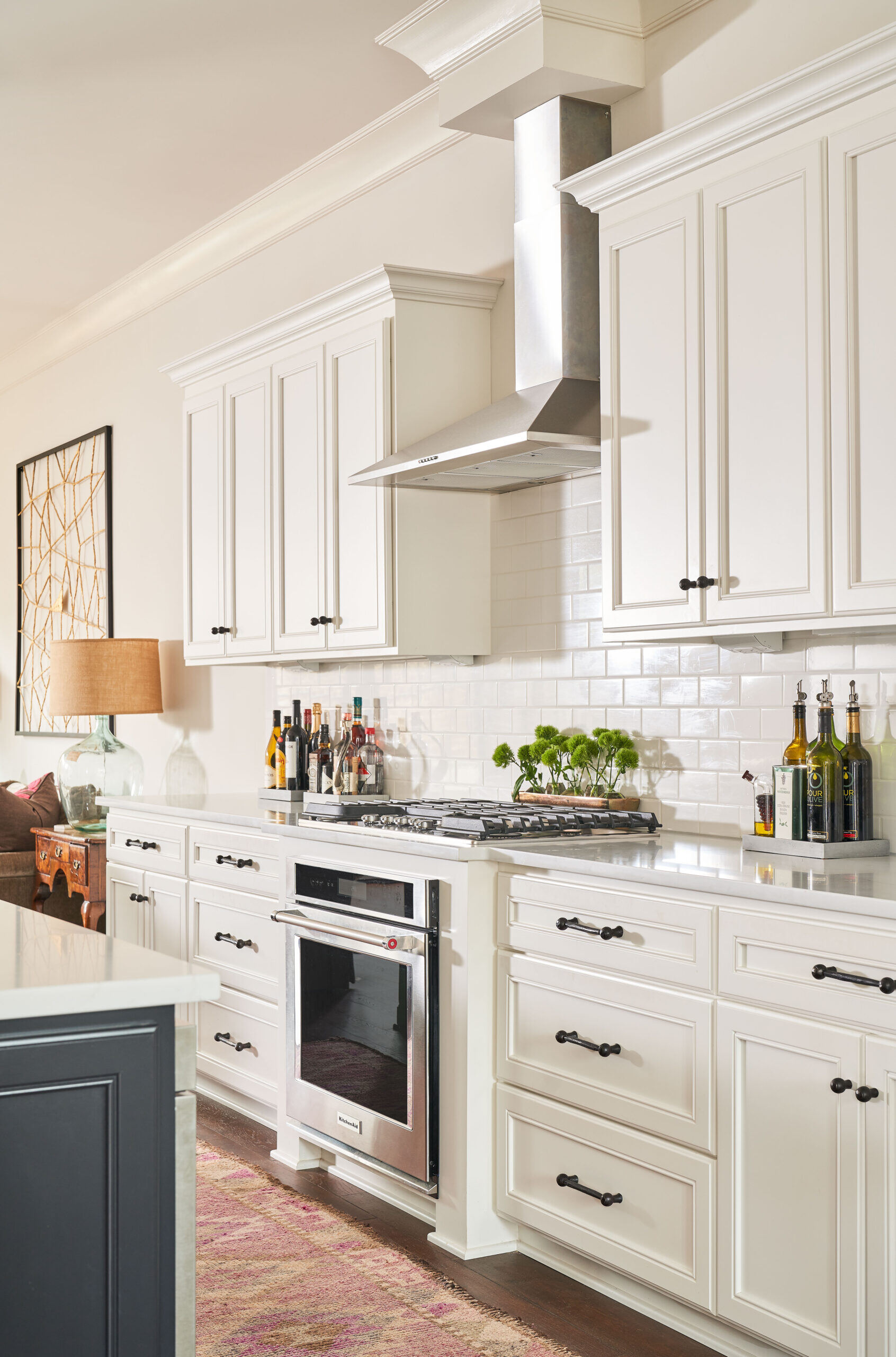 The designer selected Palmetto Road Monet Strasbourg for the hardwood floors throughout the first floor. A spacious island fills the kitchen with Quartz Aurea Lincoln countertops and Eudy's Norcraft White cabinetry. The large sliding doors to the backyard inspired the buyers to then build a custom fireplace to extend the living space from inside to outside.