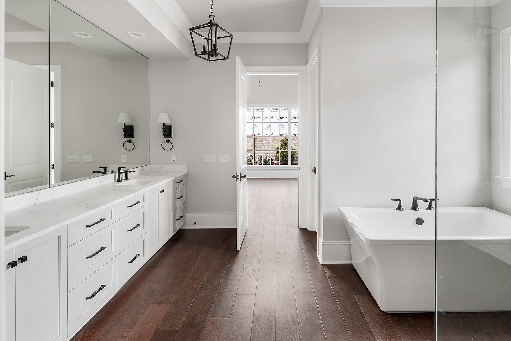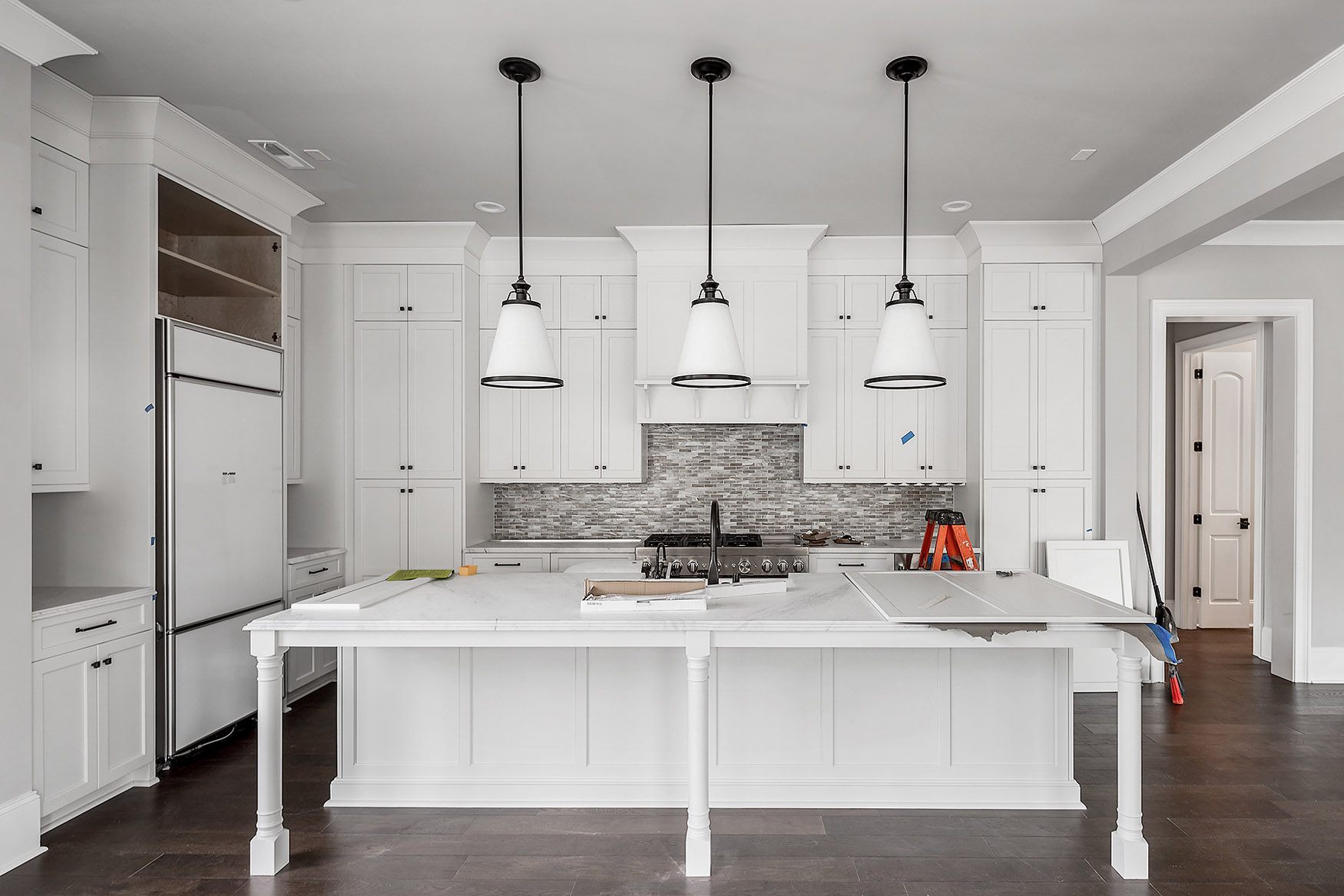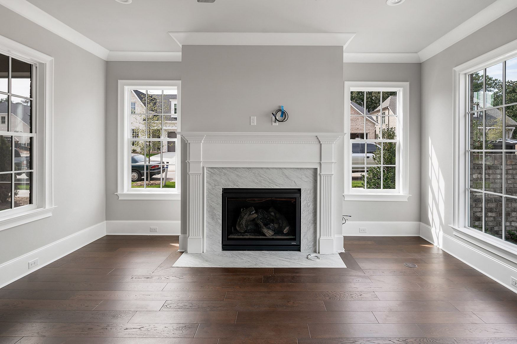 The client selected the Colony A plan with Triangle Bay Evelyn Bay exterior brick. Upon entering the home, you are greeted with Strasbourg hardwood flooring which leads you into a spacious kitchen. The countertops are Bottega Verona White paired with Sherwin Williams Alabaster painted cabinets.
