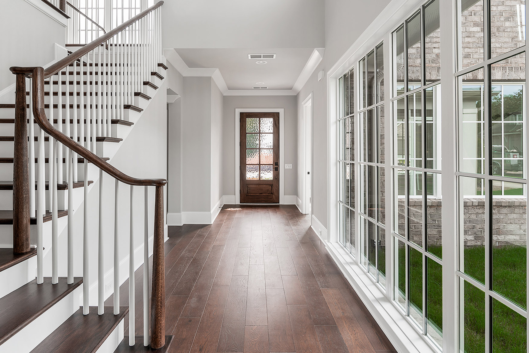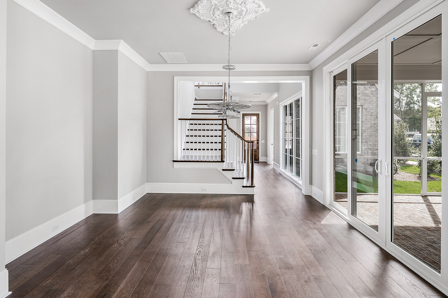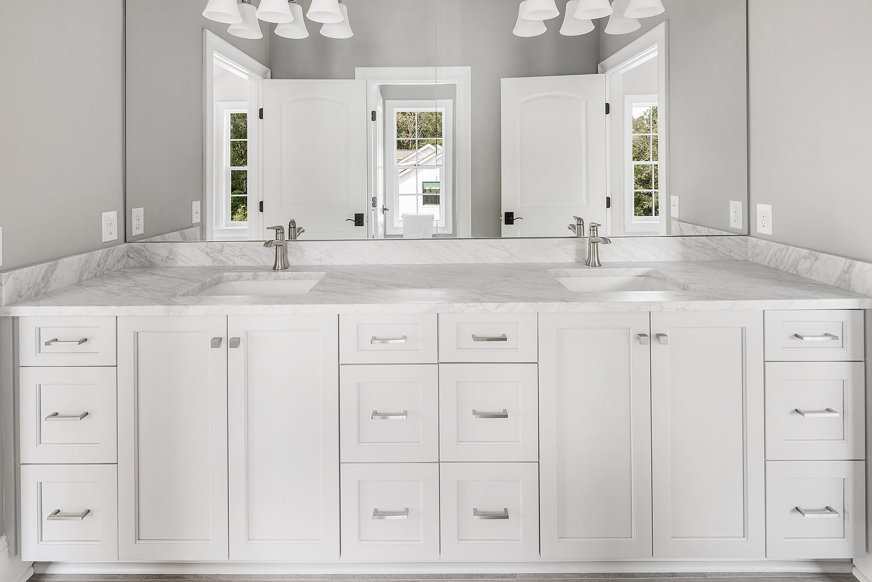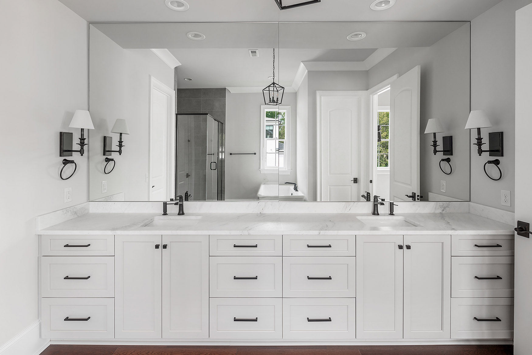 The client selected the Colony A plan with Triangle Bay Evelyn Bay exterior brick. Upon entering the home, you are greeted with Strasbourg hardwood flooring which leads you into a spacious kitchen. The countertops are Bottega Verona White paired with Sherwin Williams Alabaster painted cabinets.