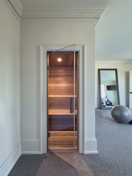 We designed a dedicated custom home gym and an adjacent built-in sauna, giving the homeowners a private space to reset and recharge. The design quality and attention to detail of these rooms match the rest of the home.