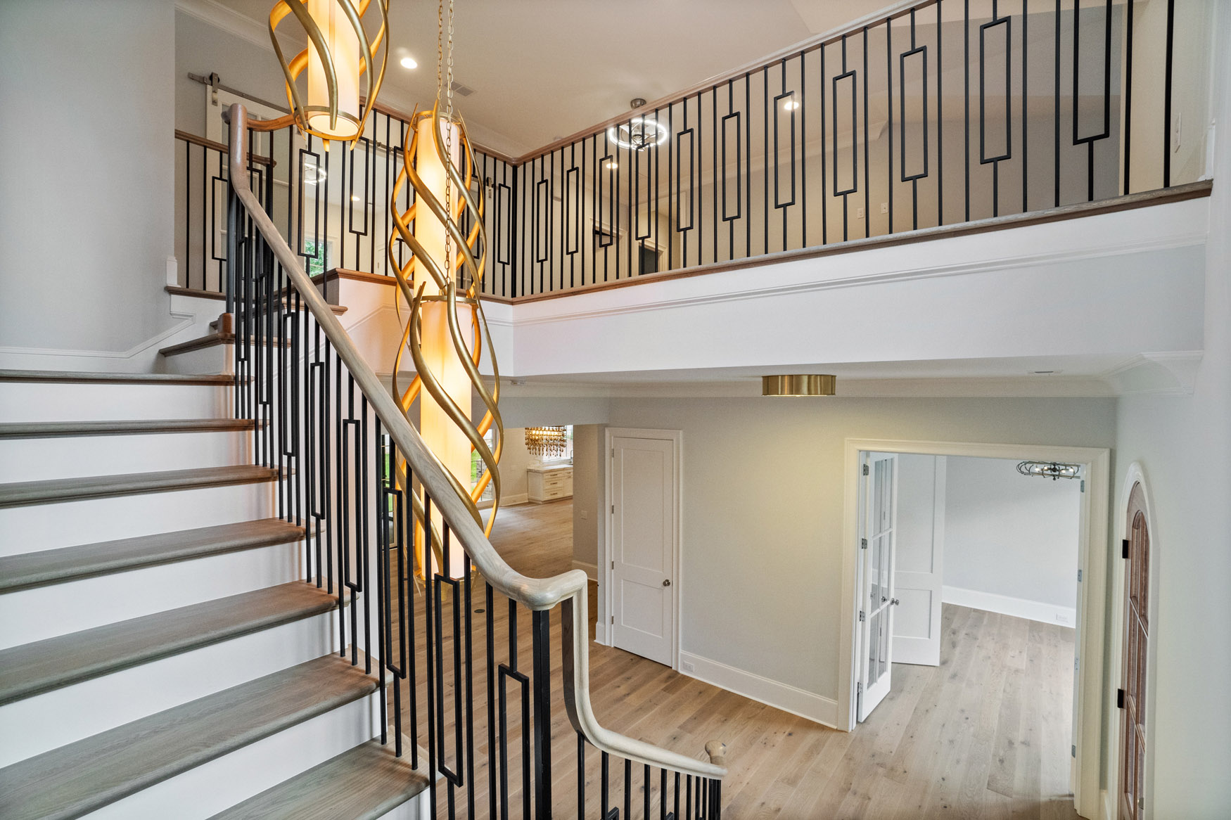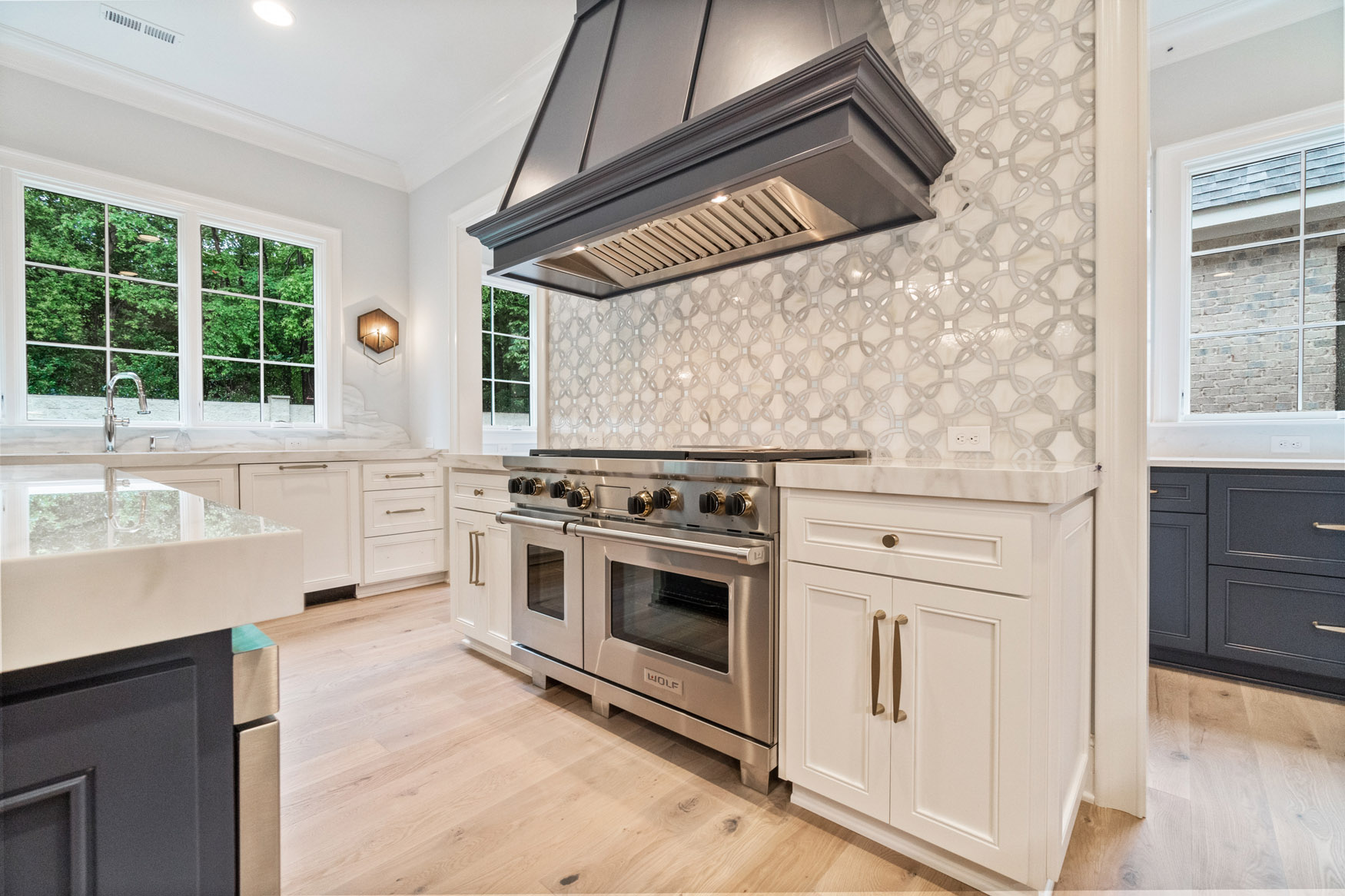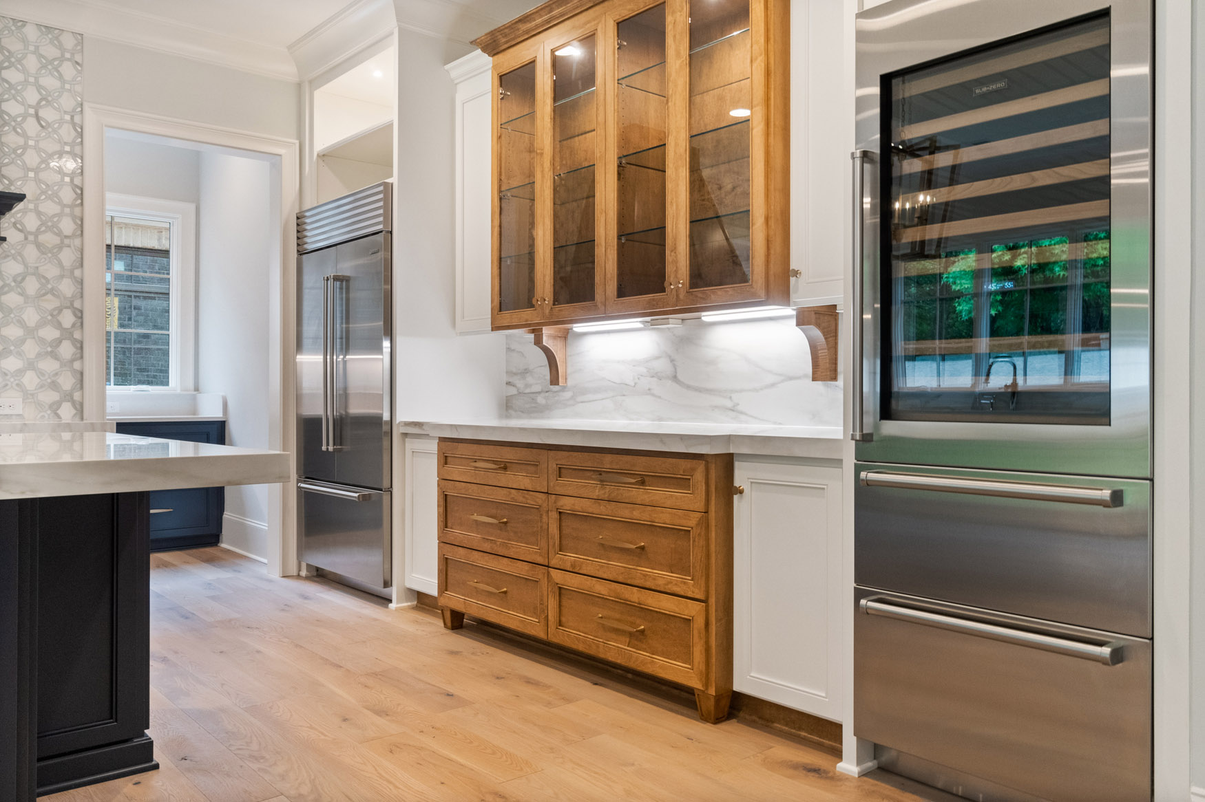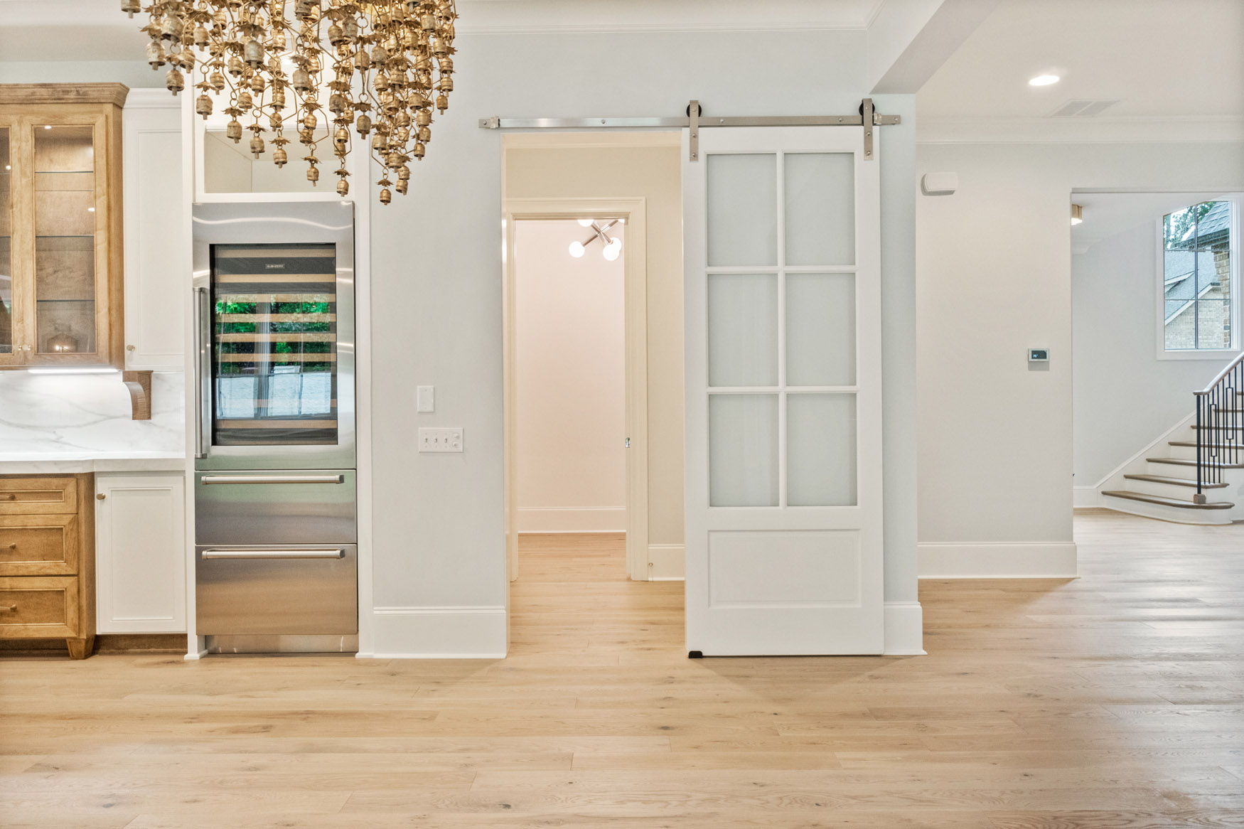 The Enclave at Foxcroft - This home is filled with white oak stair treads to match the Palmetto Monet Orleans hardwood floor throughout. The client selected Bianco Jewel Quartize countertops and have upgraded to Wolf and Sub-Zero appliances.