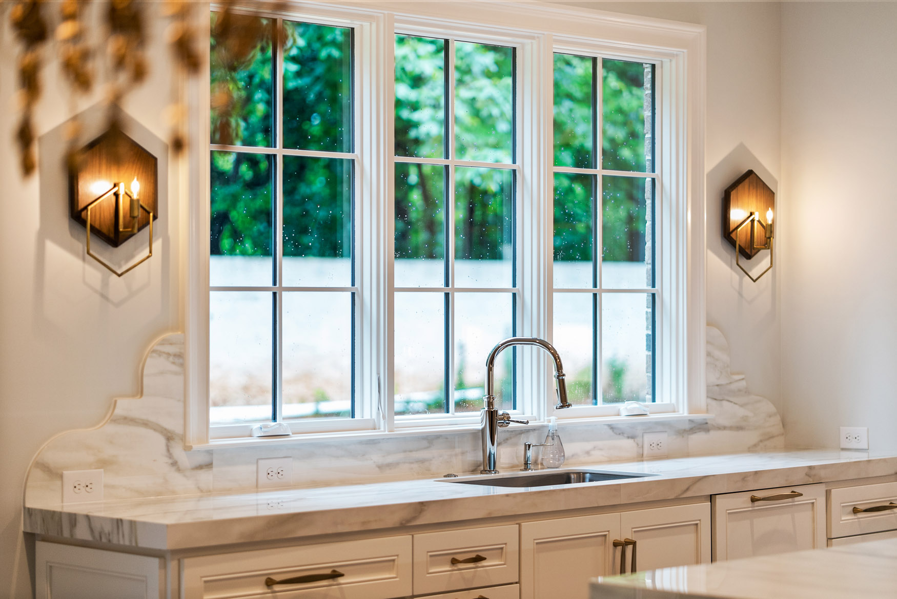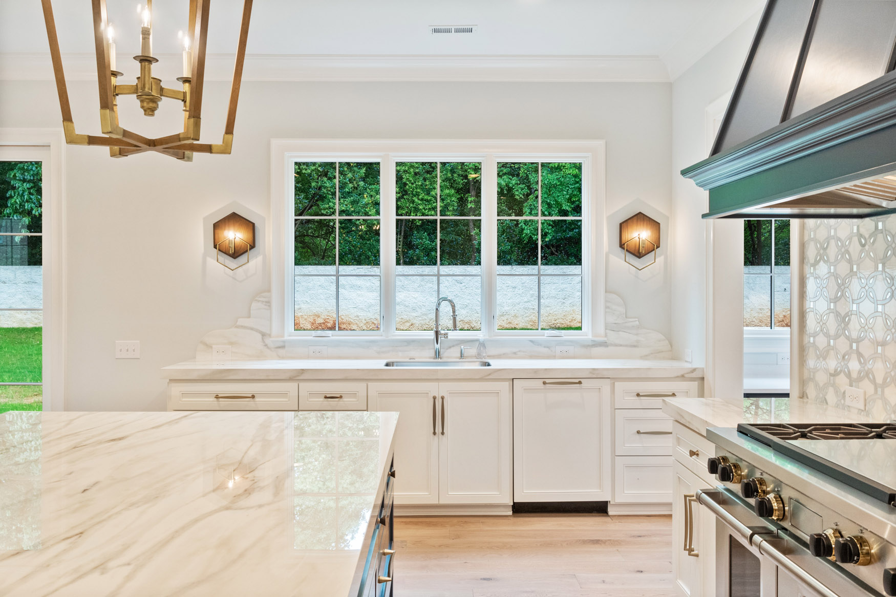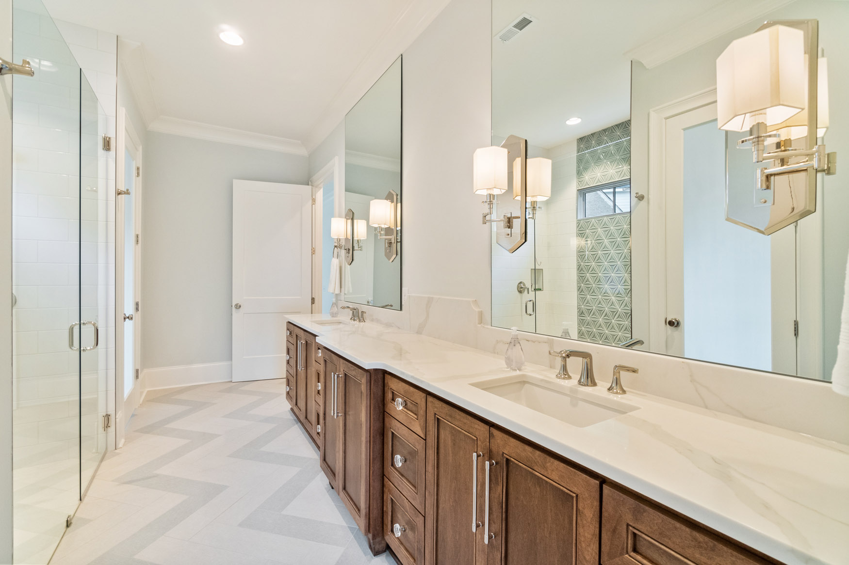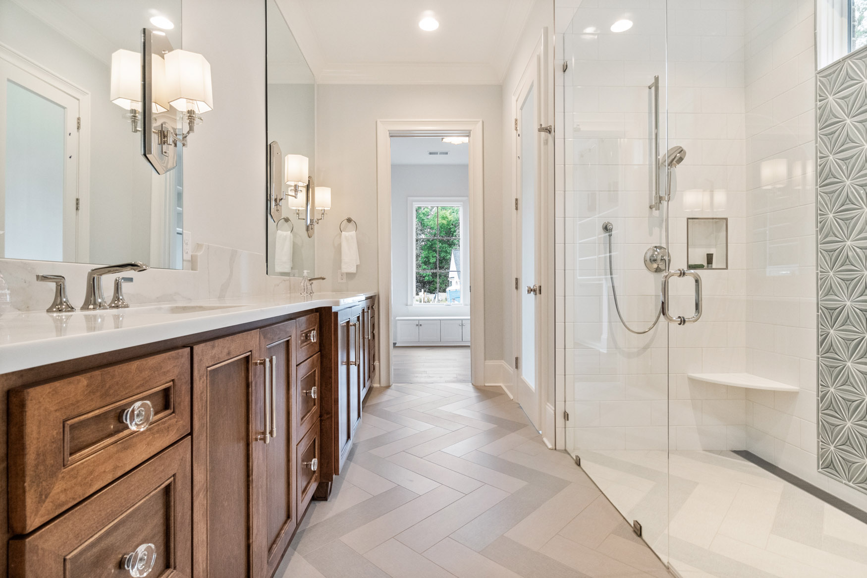 The Enclave at Foxcroft - This home is filled with white oak stair treads to match the Palmetto Monet Orleans hardwood floor throughout. The client selected Bianco Jewel Quartize countertops and have upgraded to Wolf and Sub-Zero appliances.