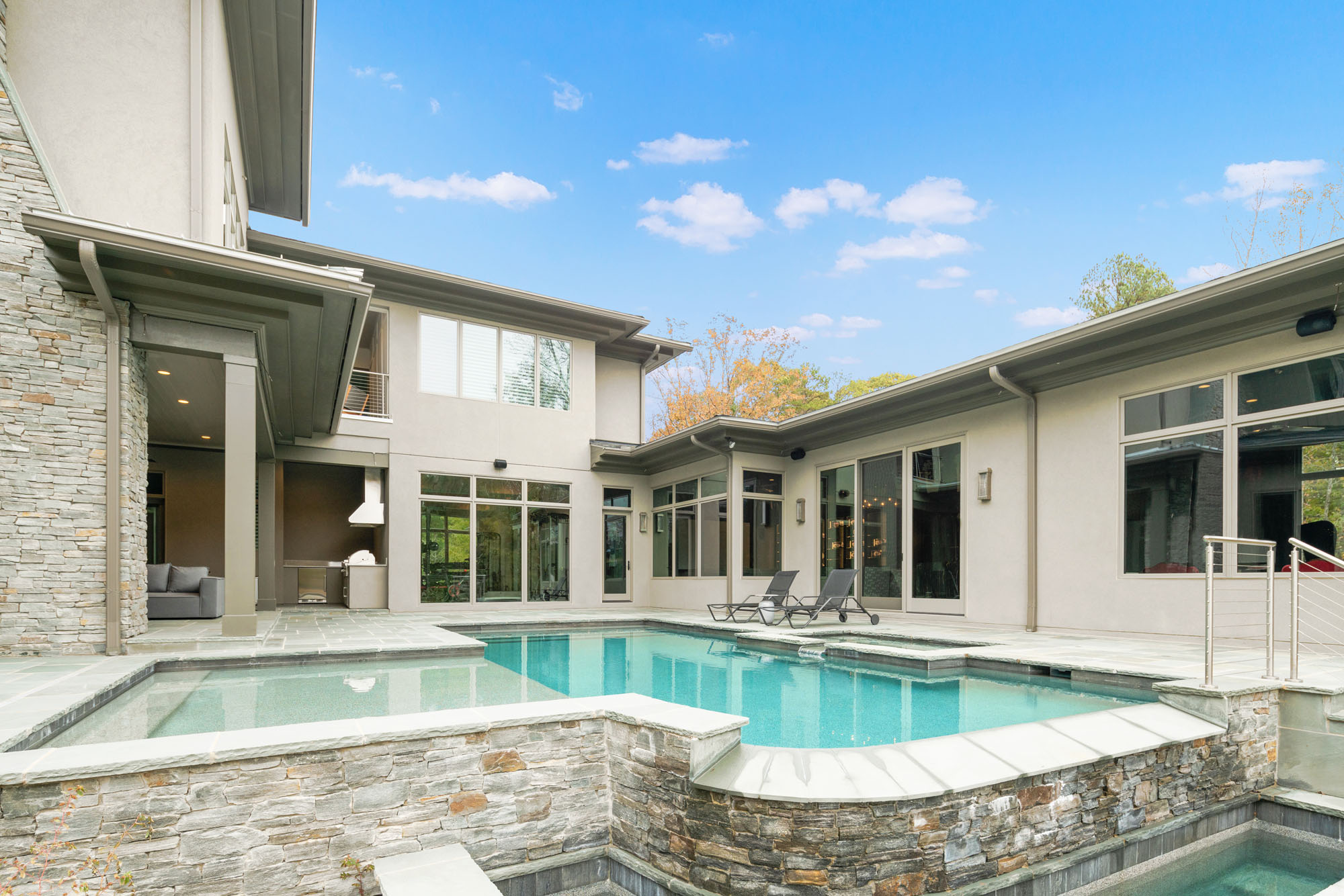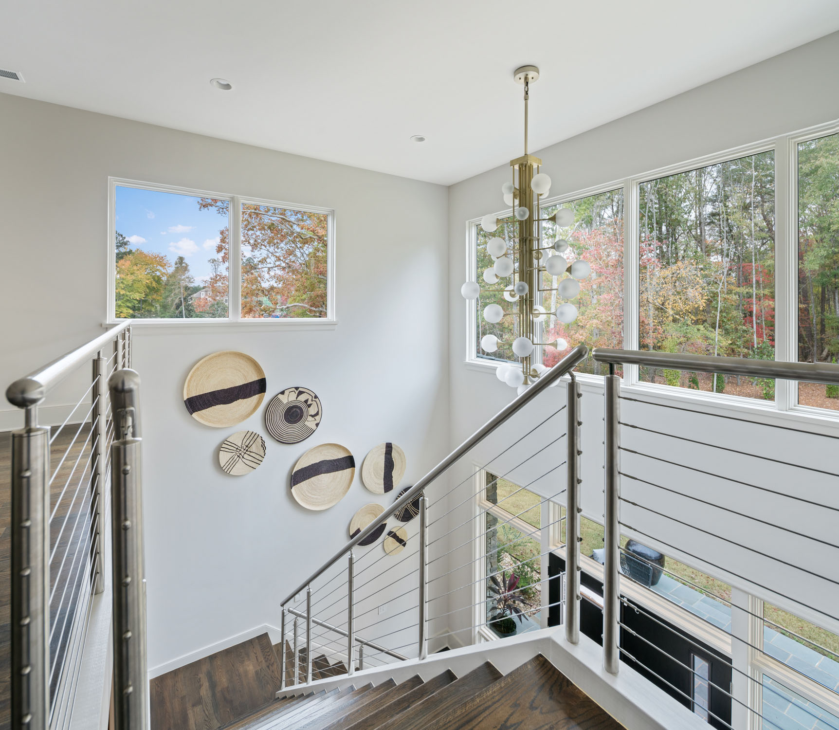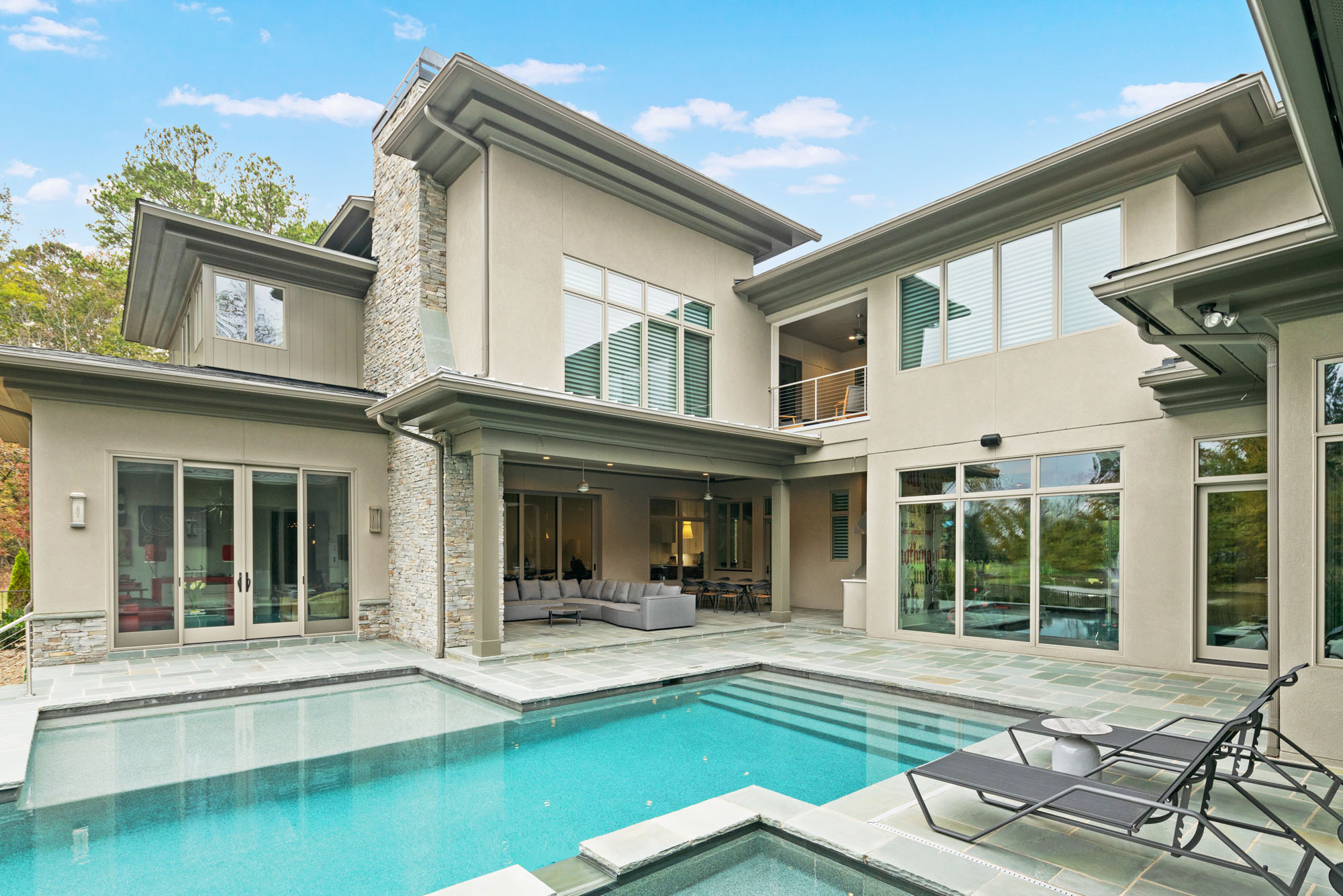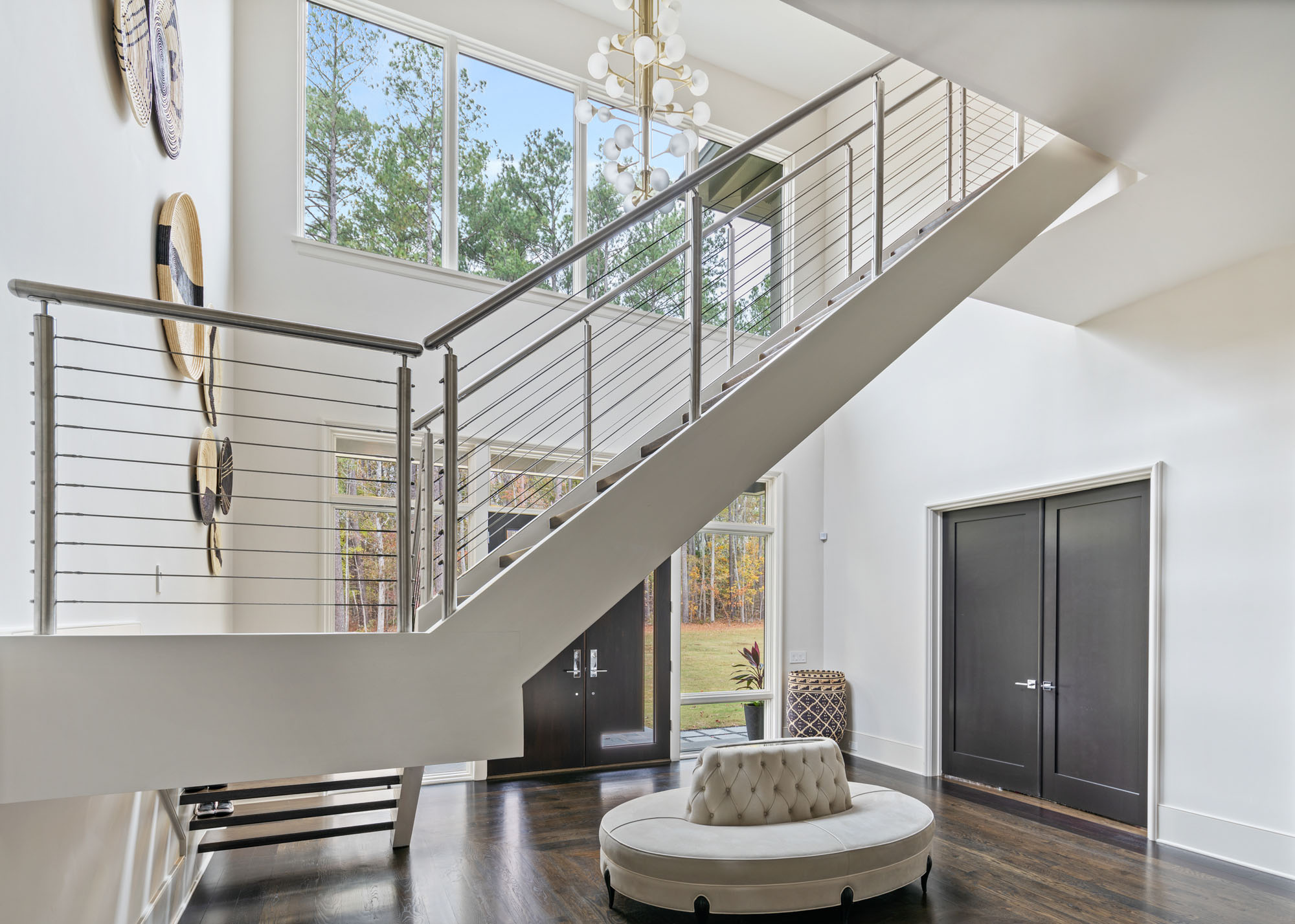 This Modern Estate, located in South Charlotte, enjoys a neutral color palette. The staircase design combines functionality with an elegant aesthetic. Light fixtures of different shapes make the interior modern design pop. The pool is the focal point and main area for entertainment.