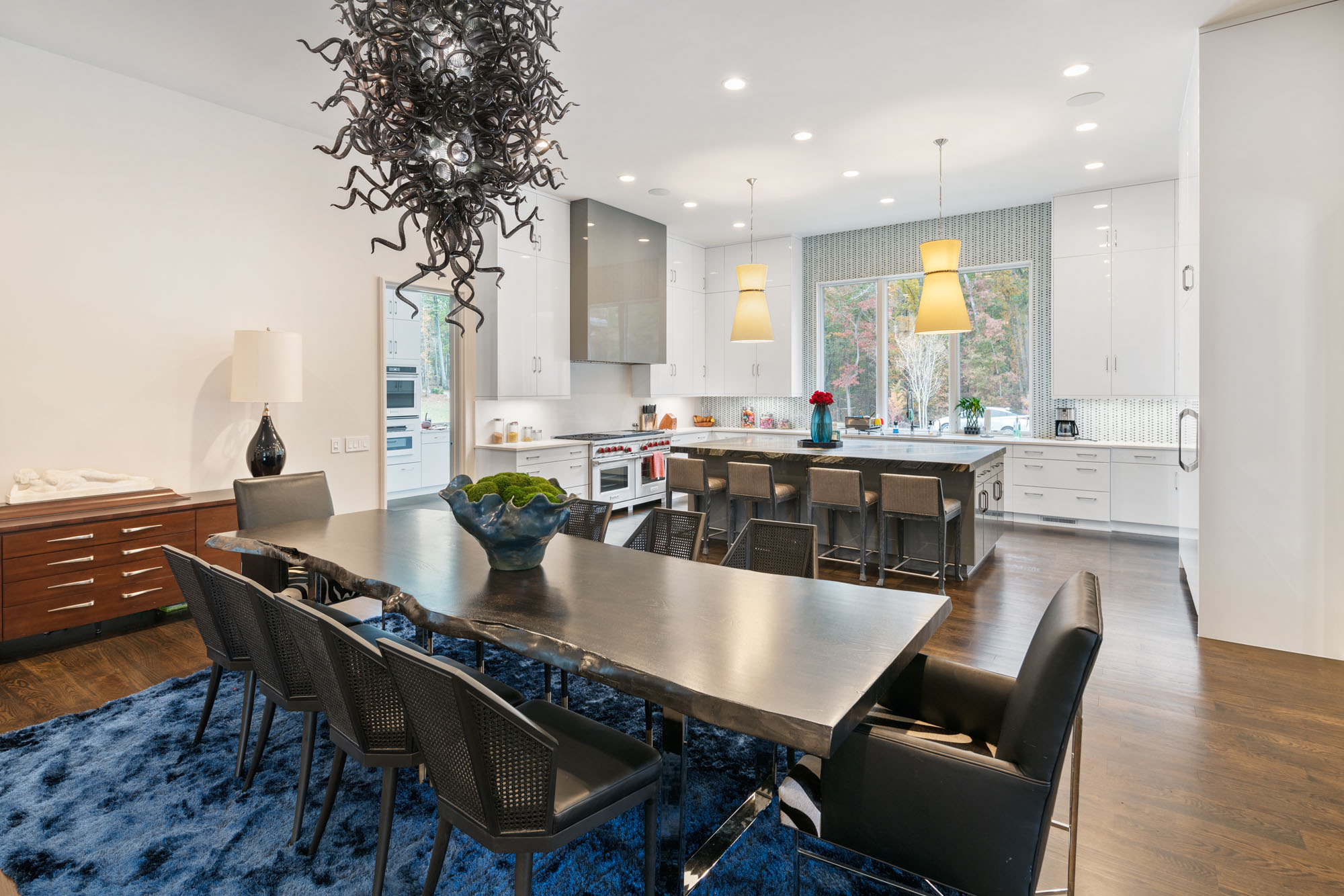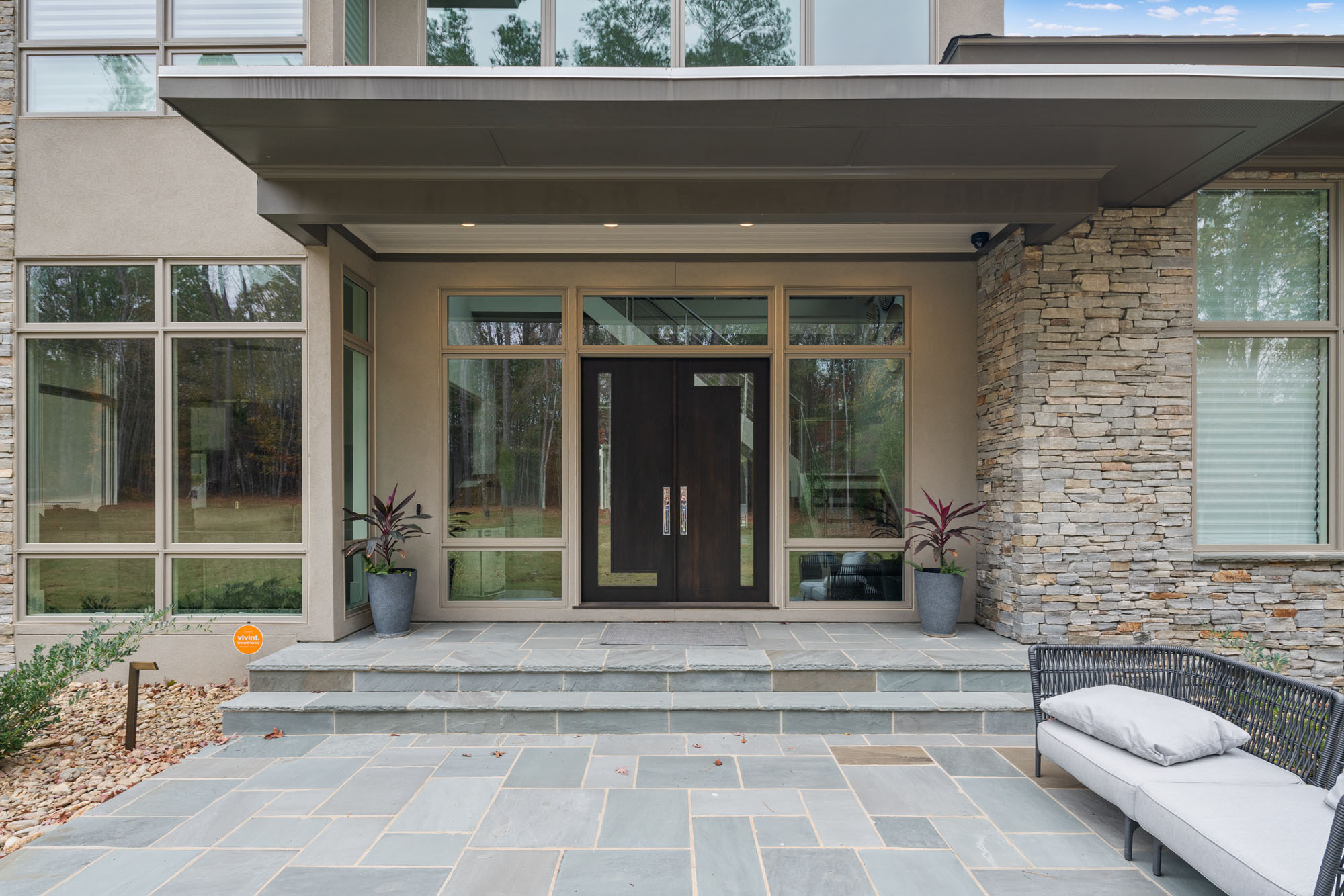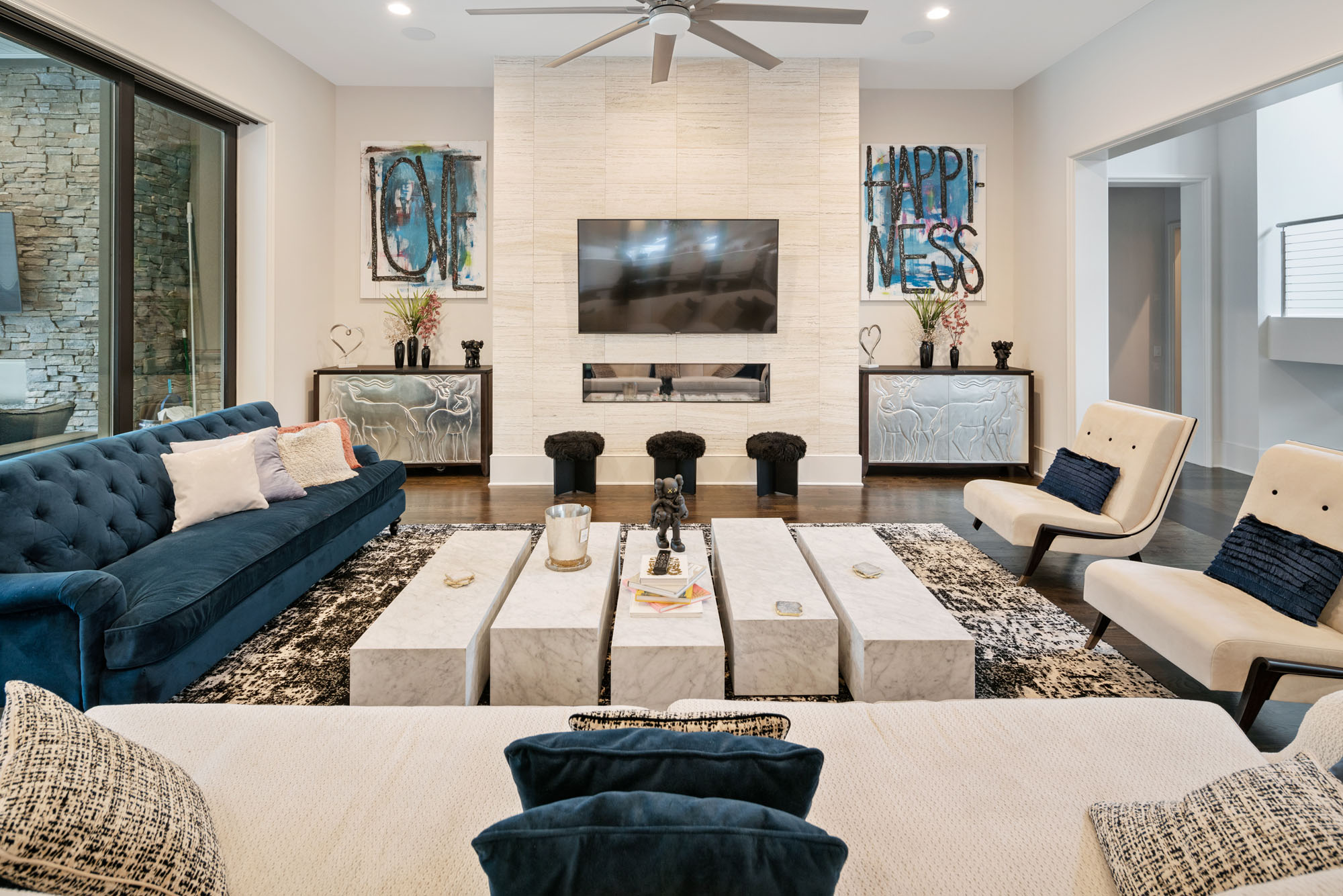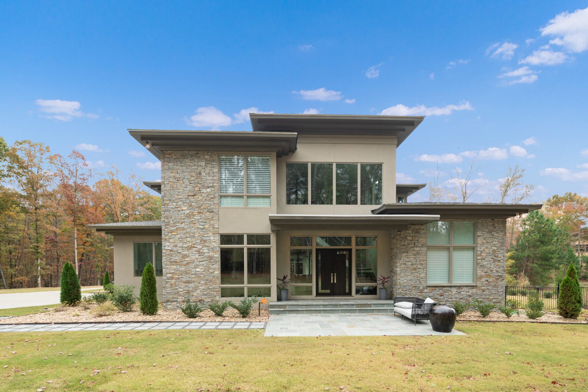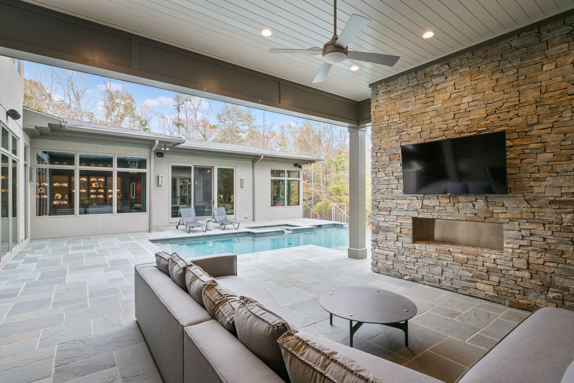 This Modern Estate, located in South Charlotte, enjoys a neutral color palette. The staircase design combines functionality with an elegant aesthetic. Light fixtures of different shapes make the interior modern design pop. The pool is the focal point and main area for entertainment.