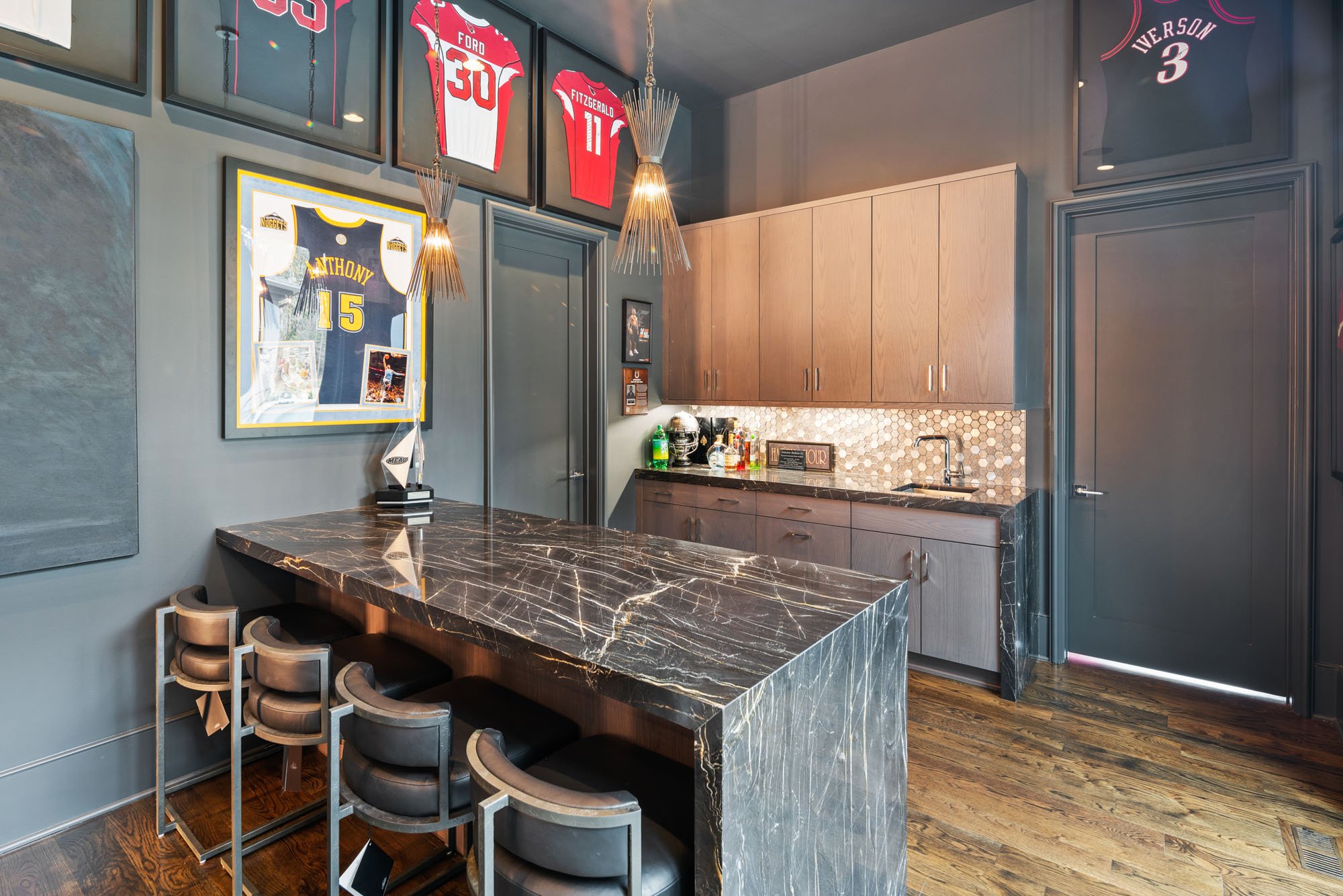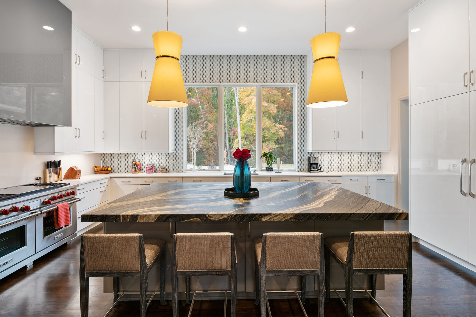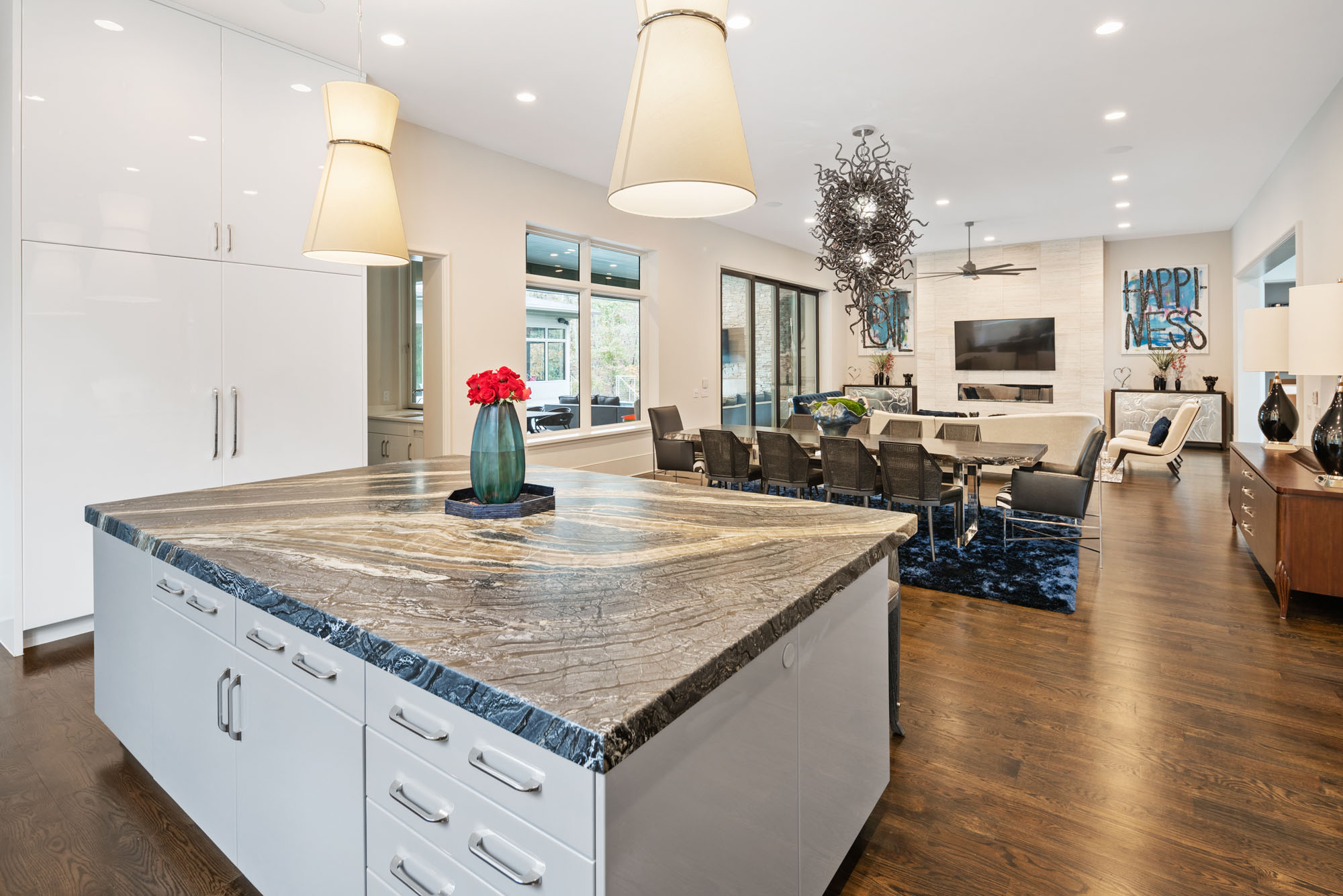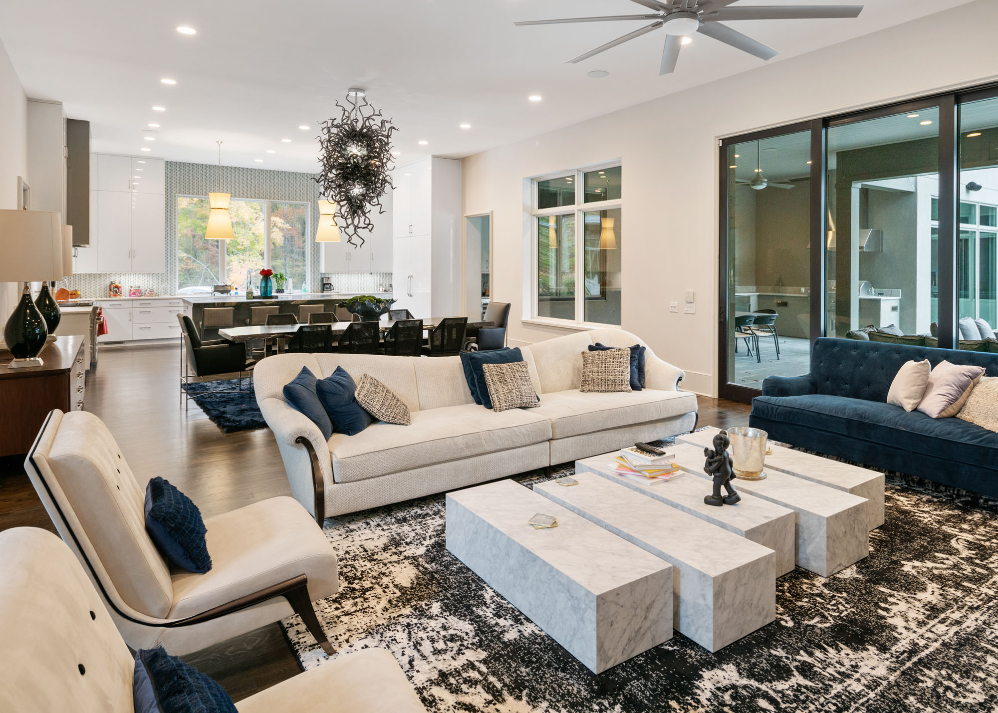 This Modern Estate, located in South Charlotte, enjoys a neutral color palette. The staircase design combines functionality with an elegant aesthetic. Light fixtures of different shapes make the interior modern design pop. The pool is the focal point and main area for entertainment.