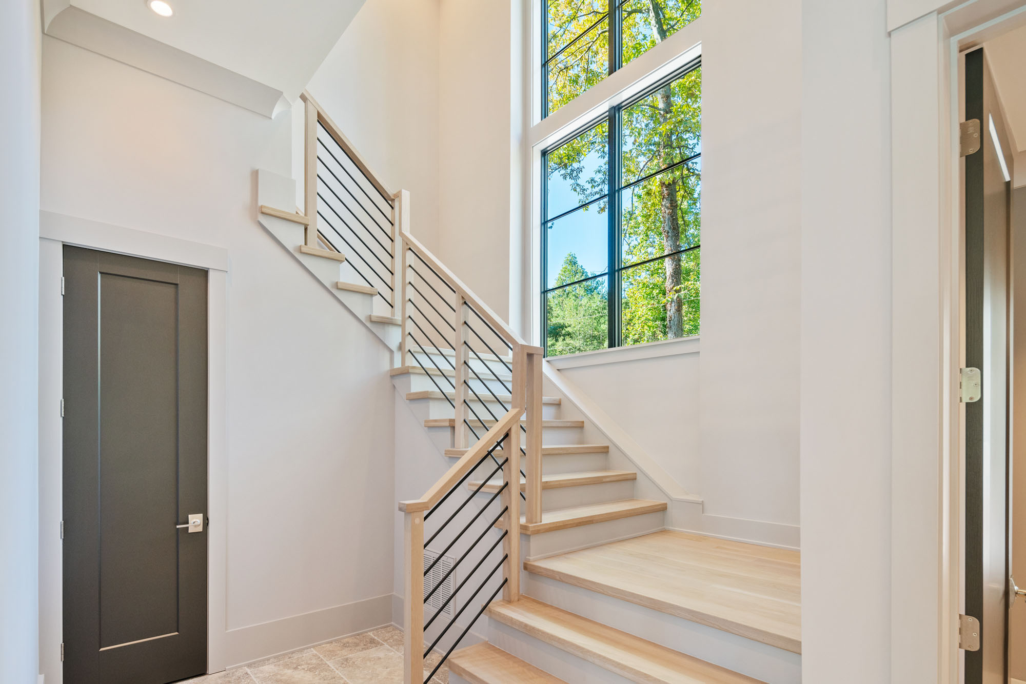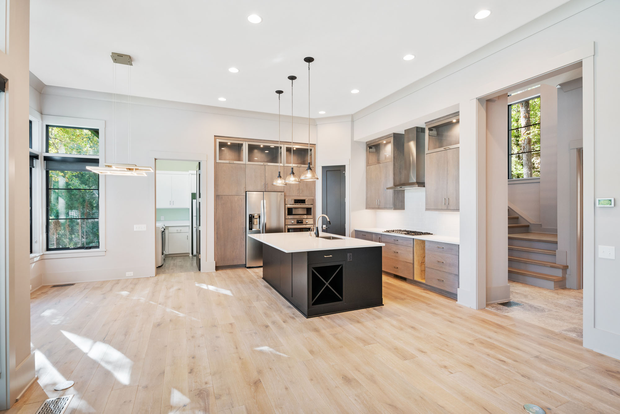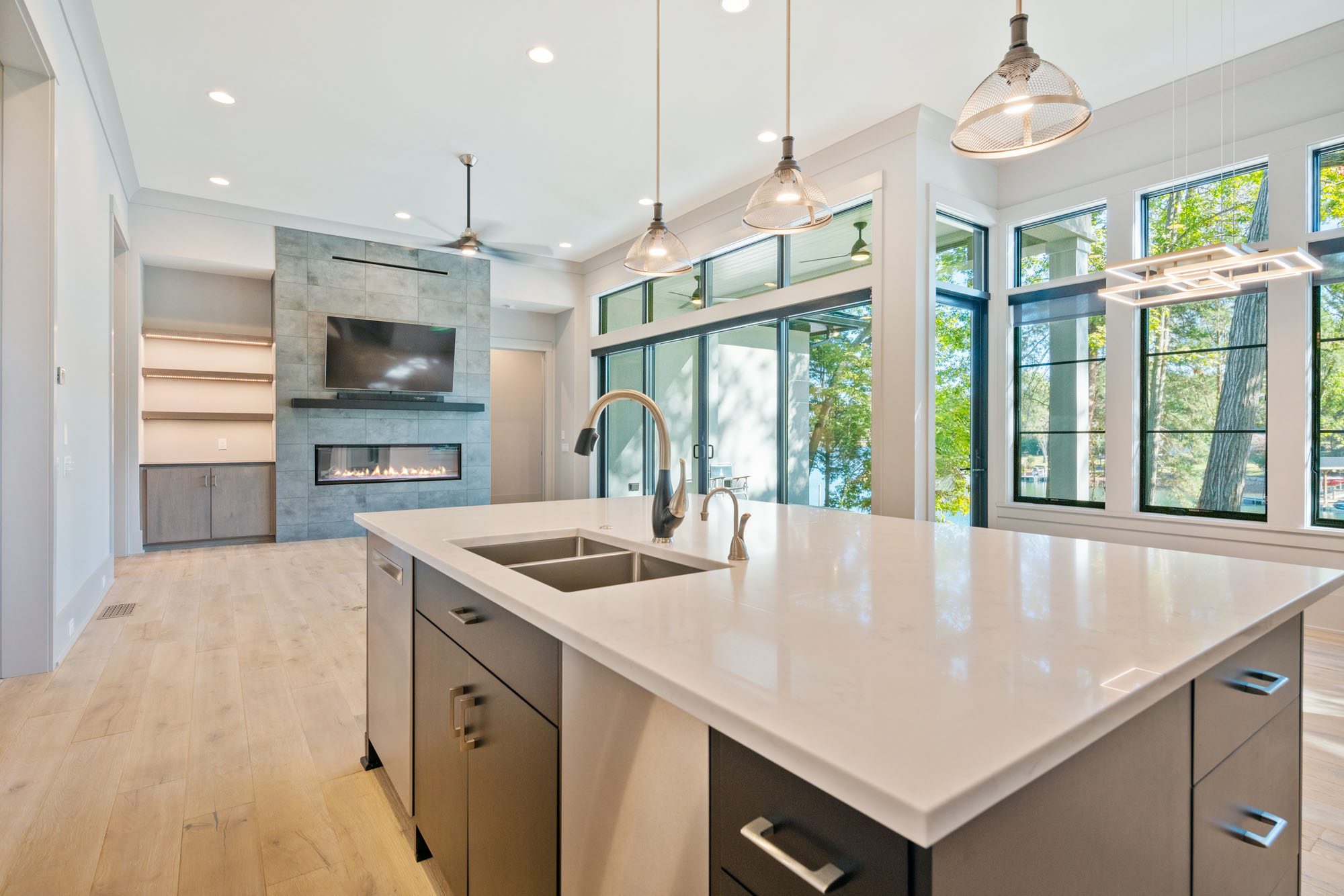 Sandset pavers invite you to this Modern waterfront home that overlooks Lake Norman. The kitchen has a tremendous amount of natural light, accompanied by custom European cabinetry.