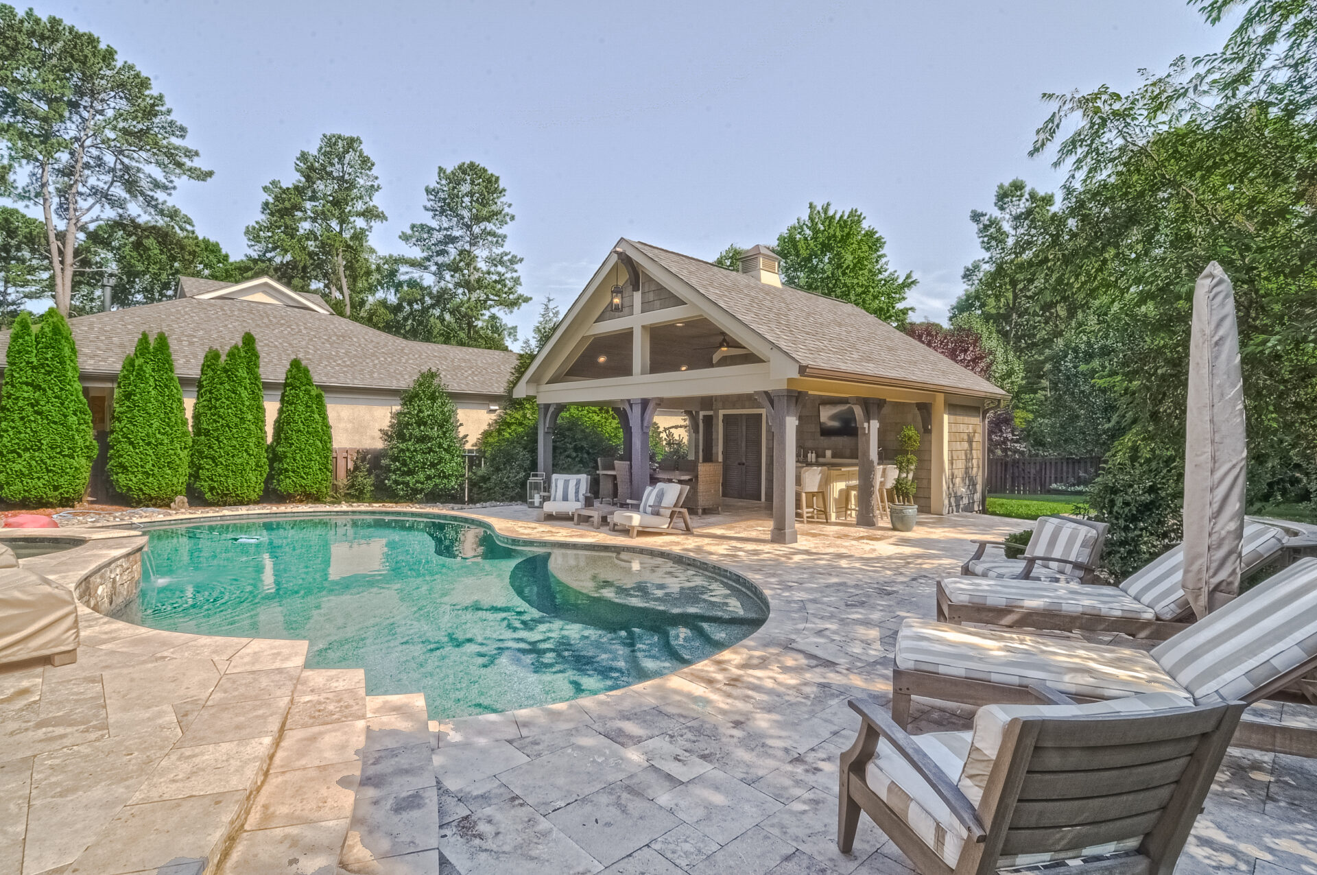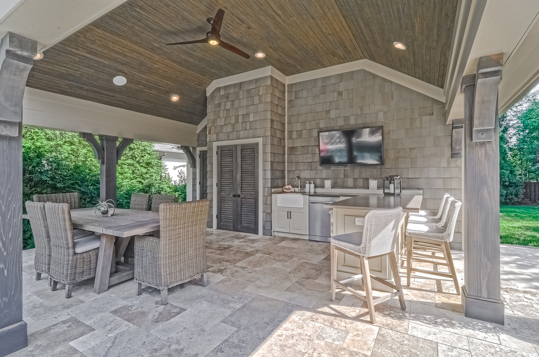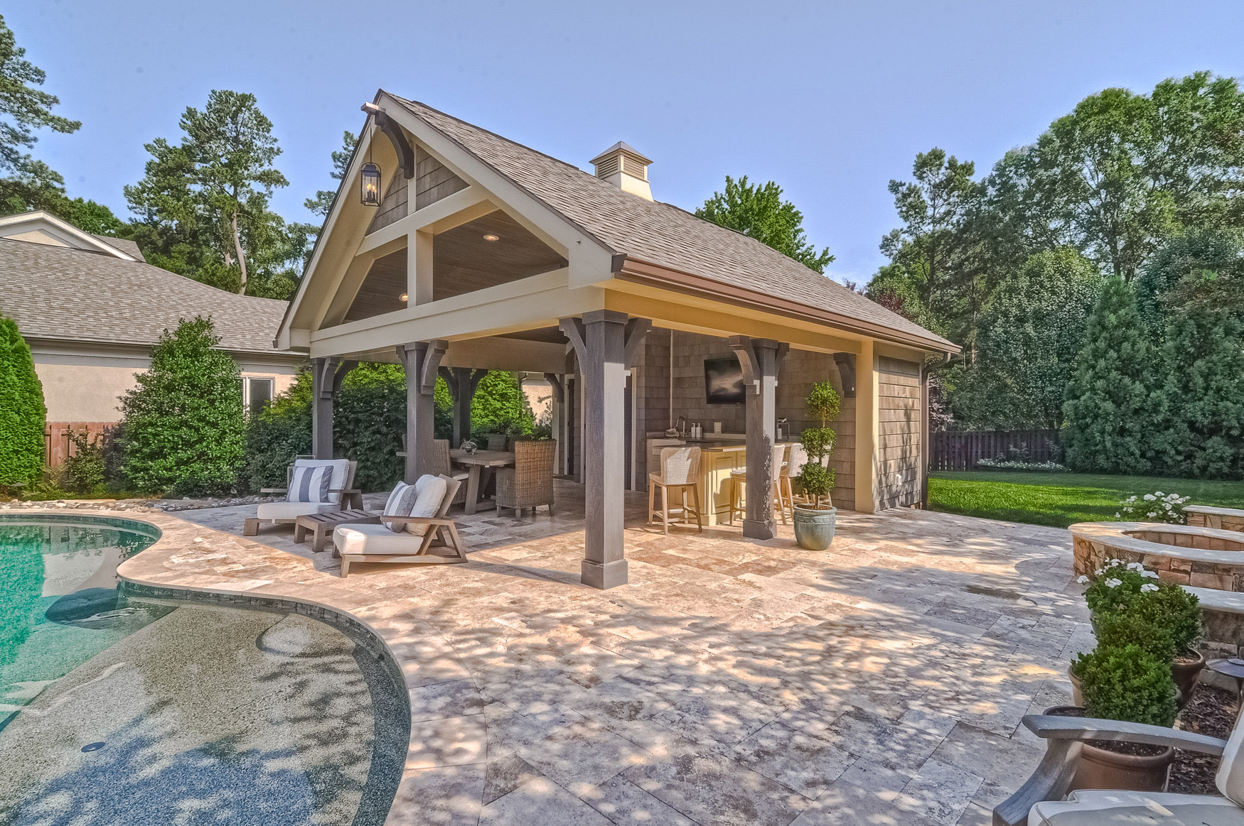 This renovation consisted of building a cabana and pool area. The clients wanted to create a space they could escape to. The cabana functions as a yoga/exercise studio and includes a full bath with a sauna, an outdoor kitchen and built-in fire pit.