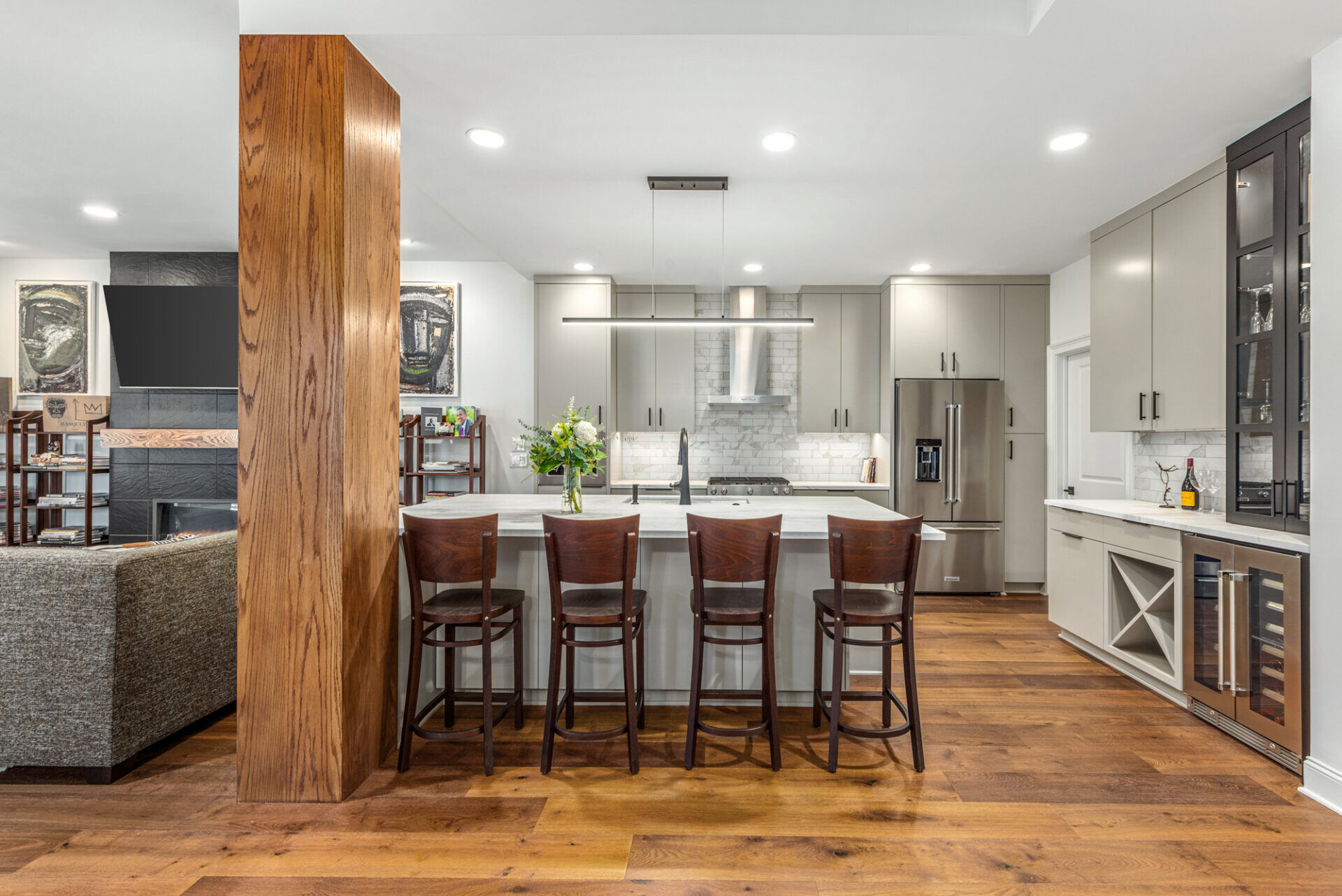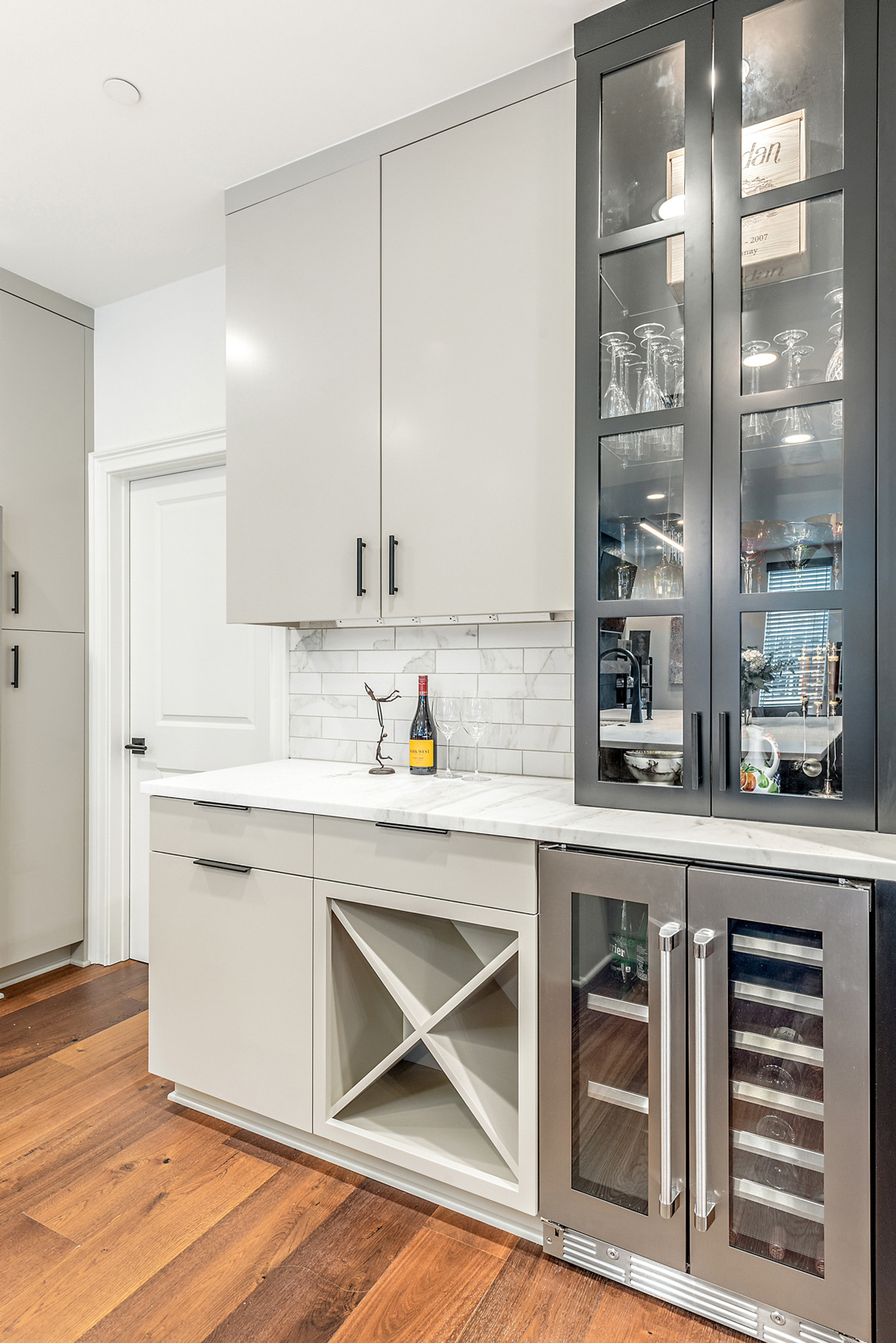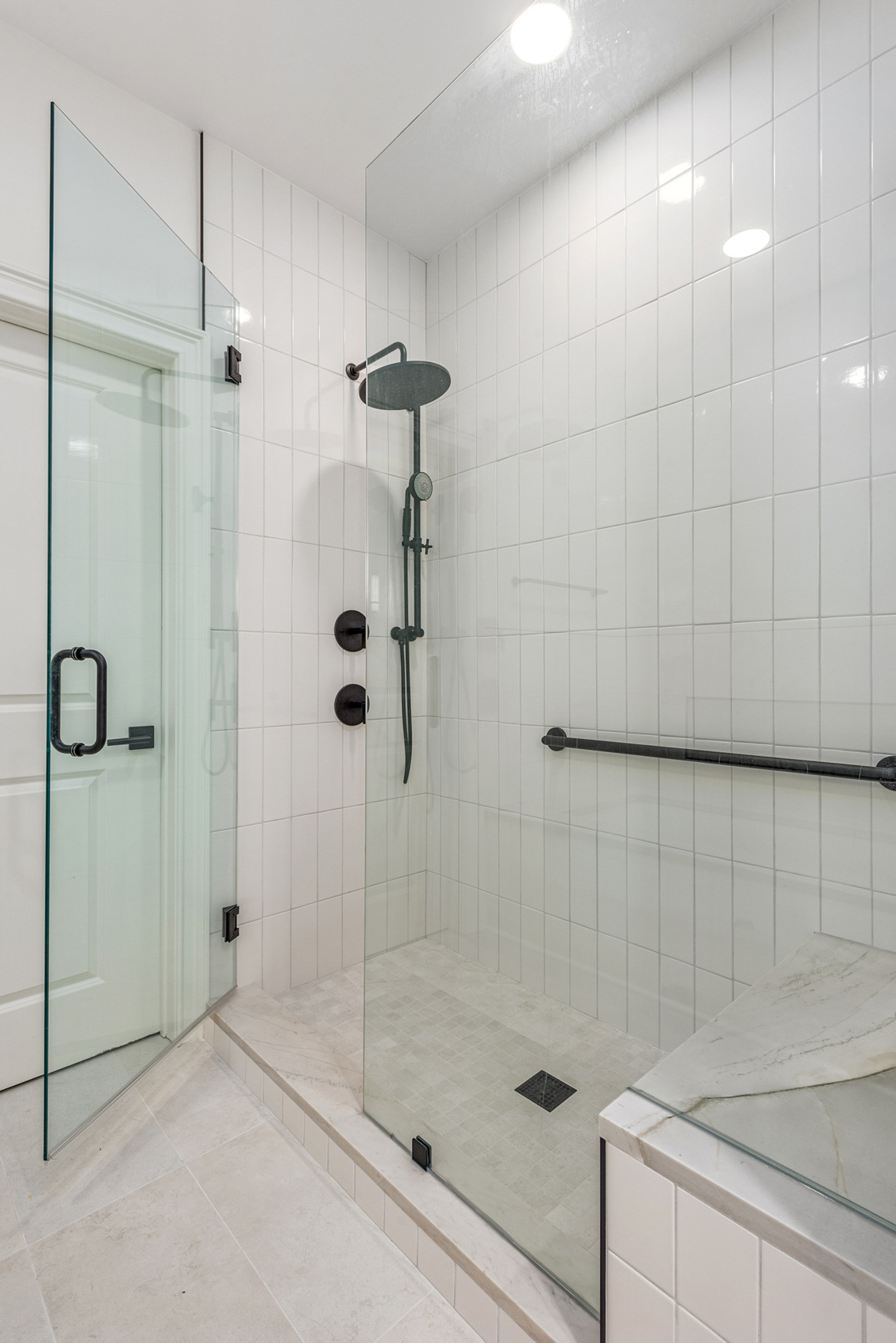 These homeowners were looking to transform their recently purchased Uptown condo to be more suitable for their downscaled lifestyle. The structural column was part of the condo's structure and needed to be incorporated in the design. The previous design of the condo was outdated, especially the master bath, and they wanted a space that was more functional for just the two of them and suitable for their age and restraints, while still fitting their aesthetic.